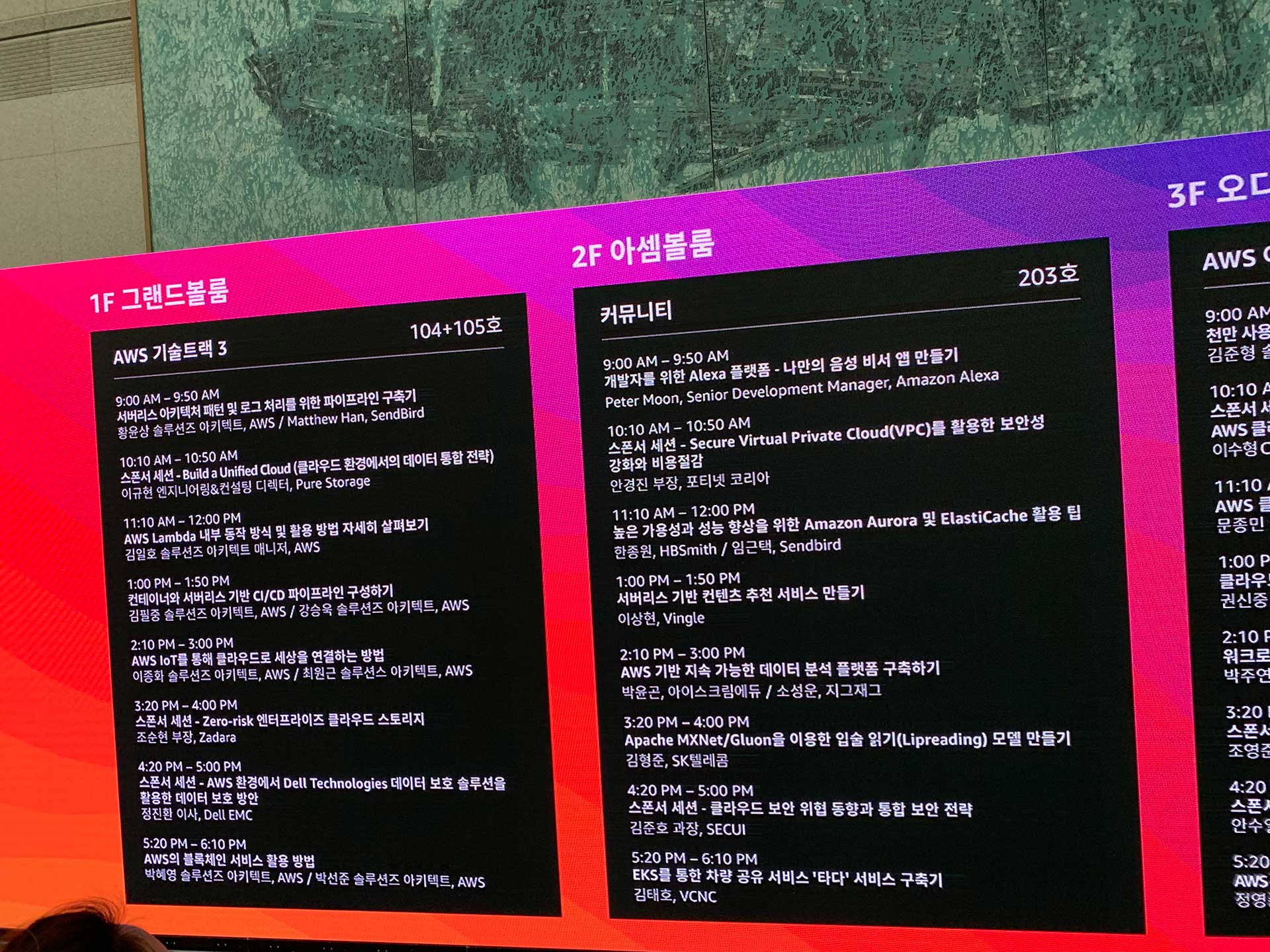 이제 다음 세션으로 골랐던 "AWS Lambda 내부 동작 방식 및 활용 방법 자세히 살펴보기"를 들으러 1층 기술트랙 3번 방으로...