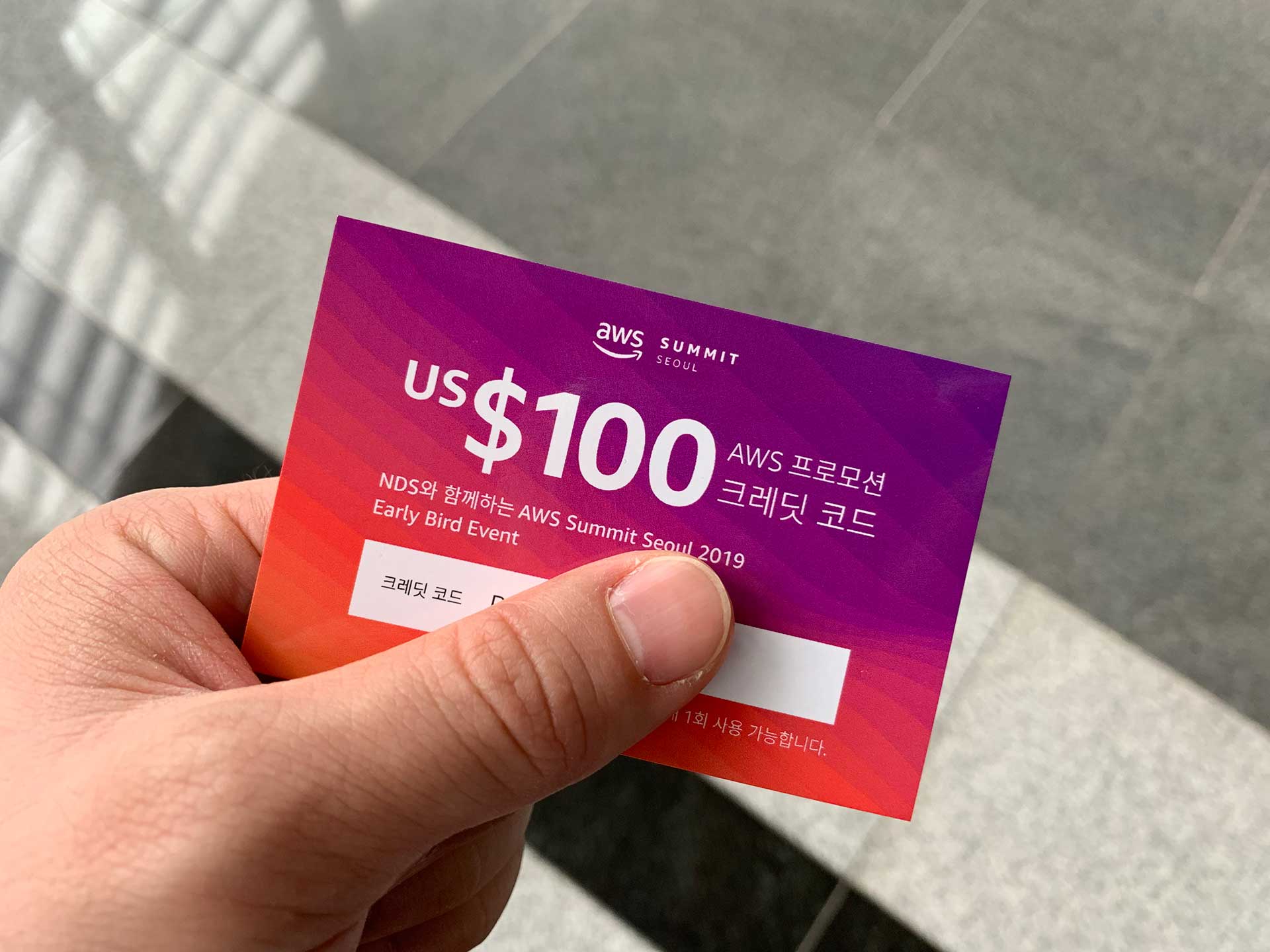 NDS 에 가서 아침 등록할 때 받은 얼리버드 교환 쿠폰을 실제 US$100 AWS 크레딧 쿠폰으로 교환.