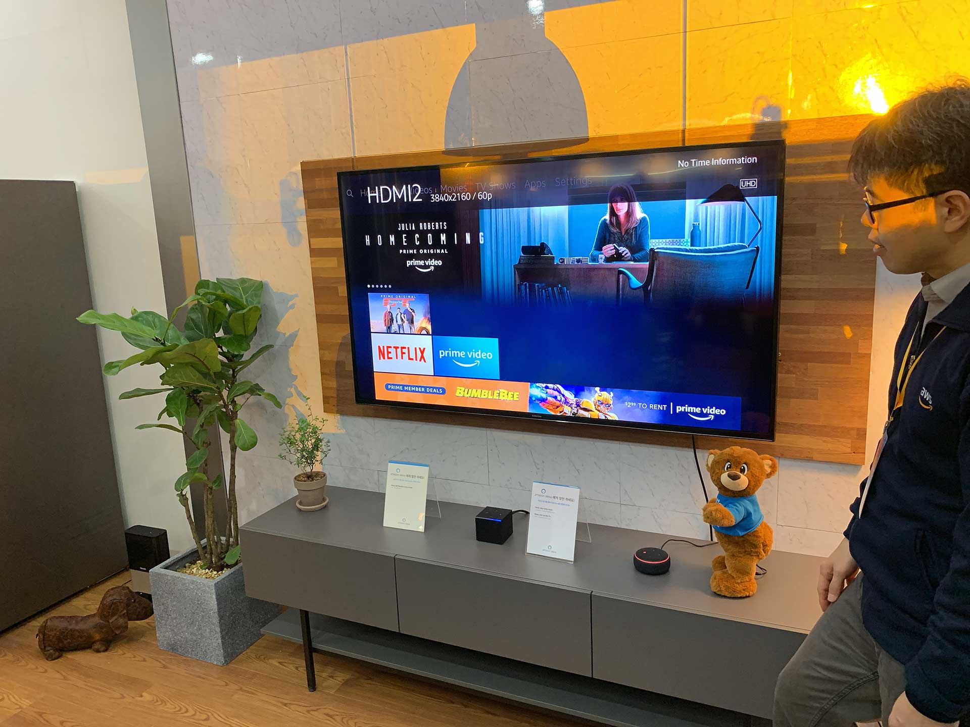 이제 거실로 나와서... 알렉사(곰돌이 인형 옆에 작은 원형 제품)에 이야기하니...