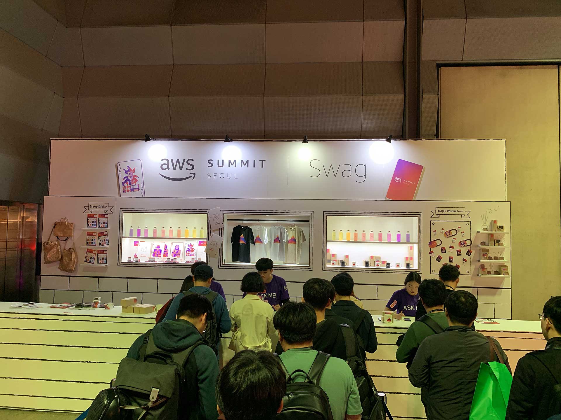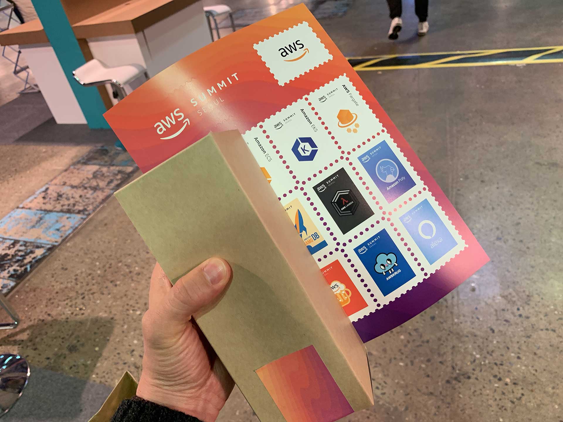 AWS 써밋 서울 기념 우표 스티커와 보틀을 받을 수 있습니다.