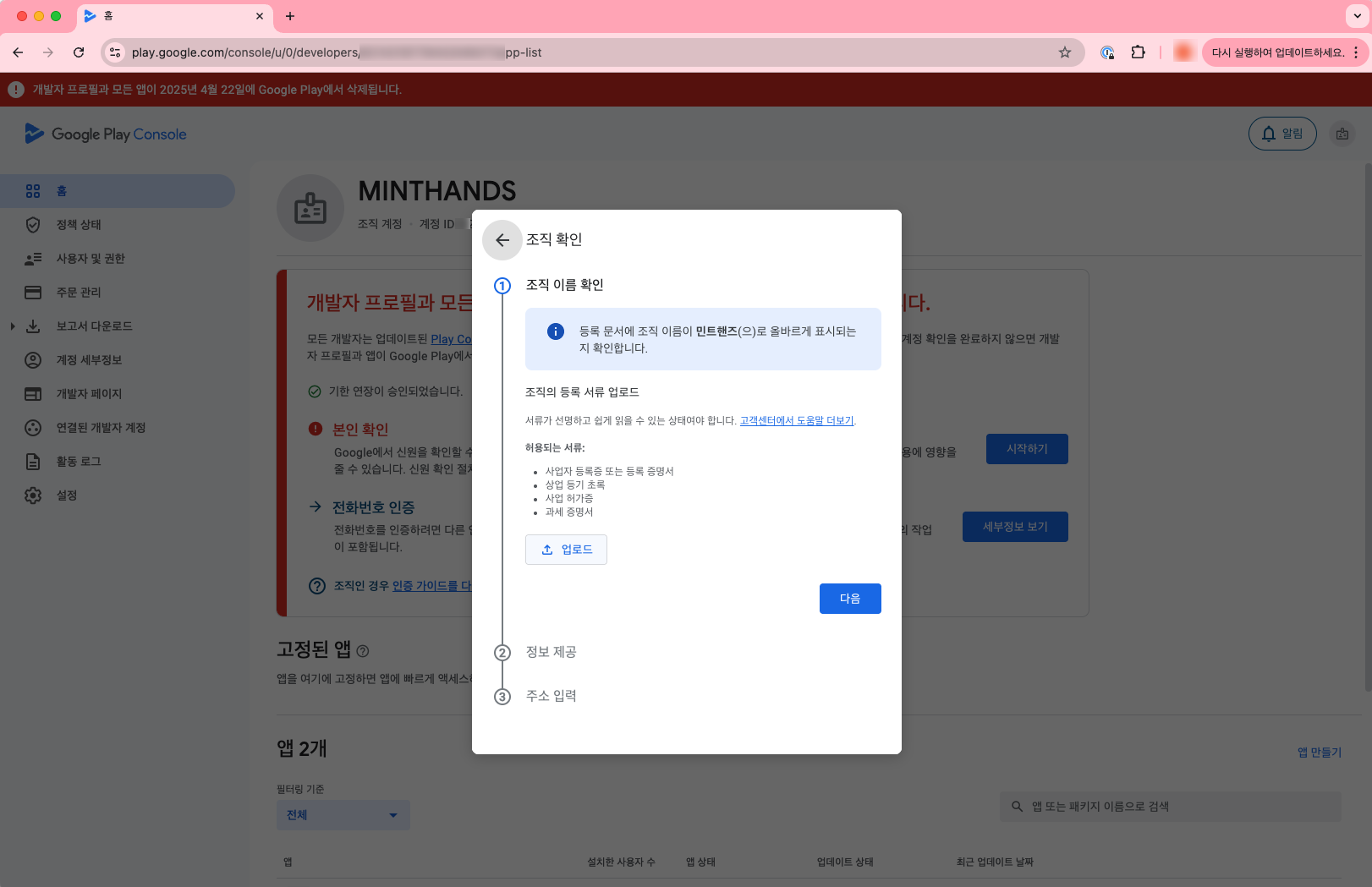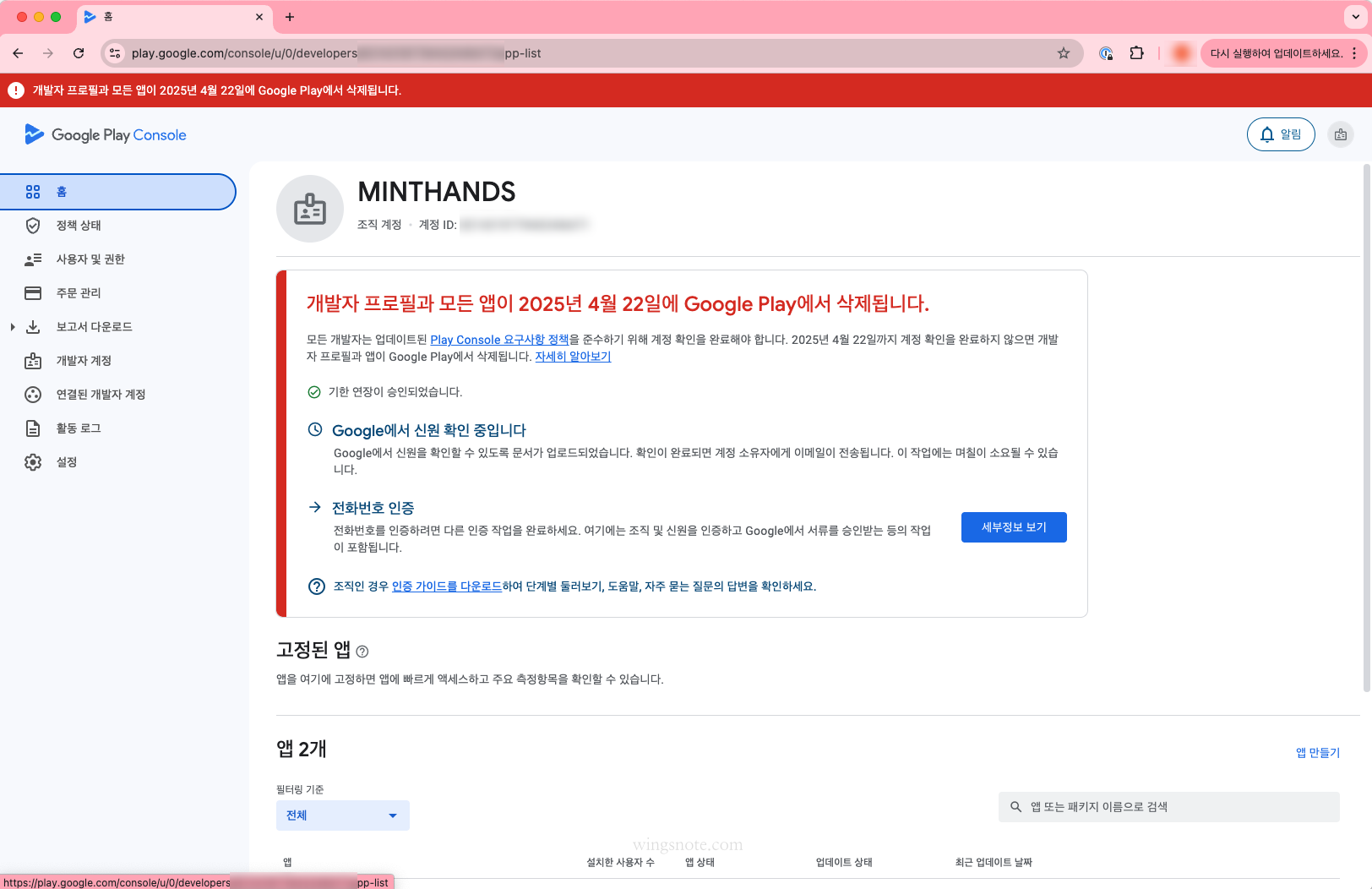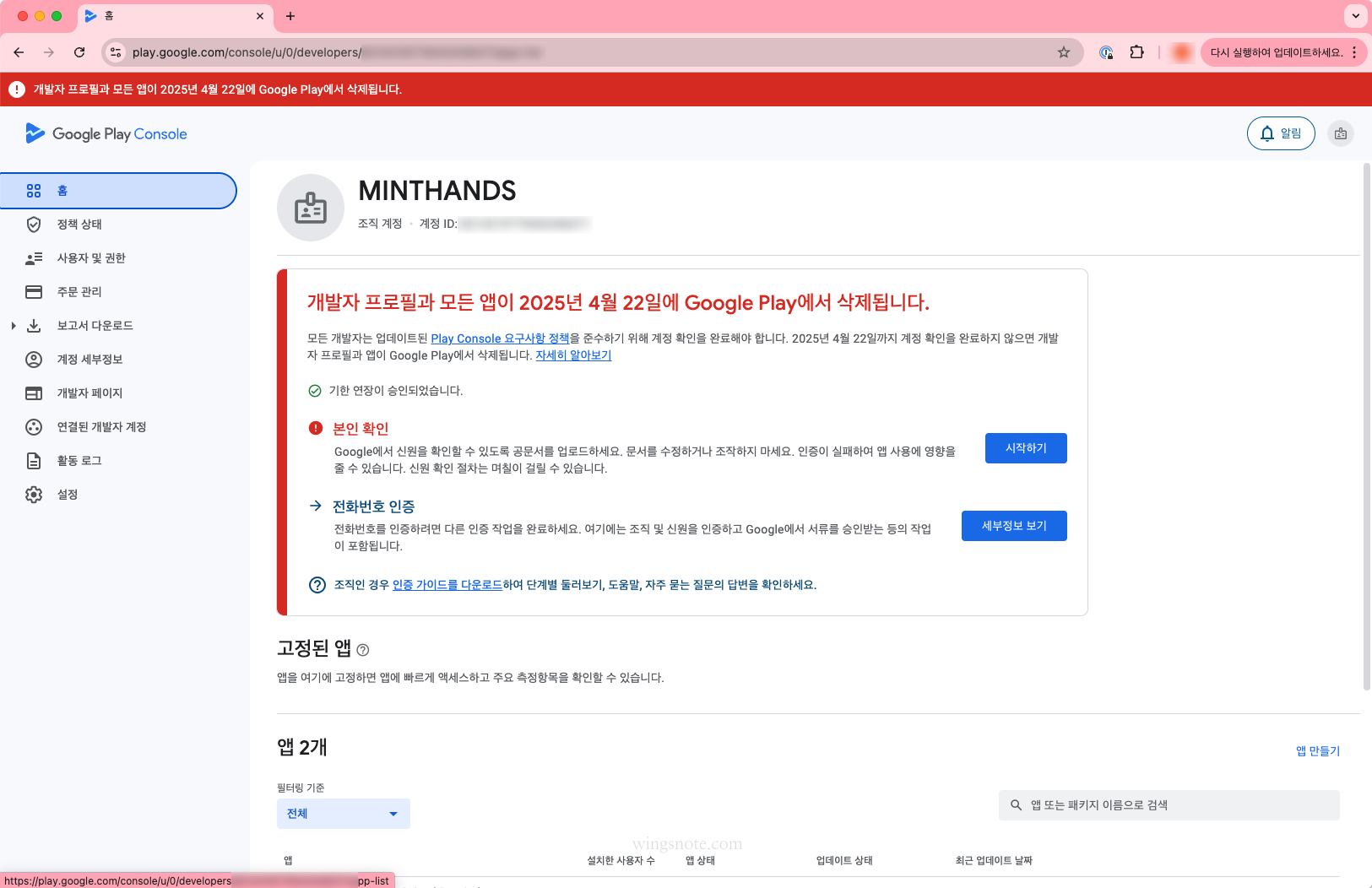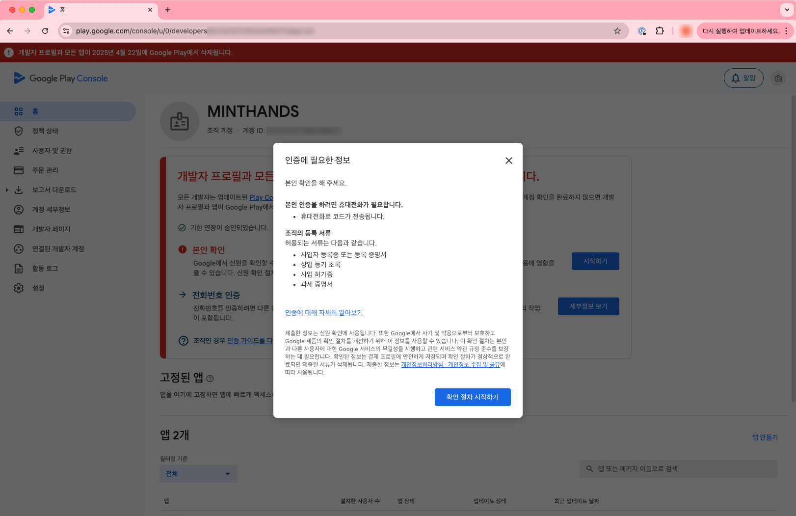 아래 화면과 같이 기한 내에 개발자 계정 인증을 하지 않으면 개발자 프로필과 모든 앱이 삭제 된다는 무시무시한 경고를 볼 수 있습니다.