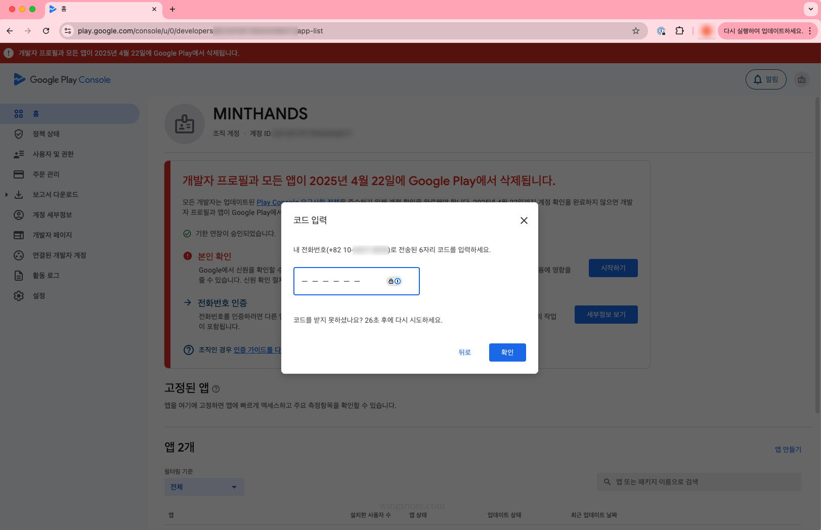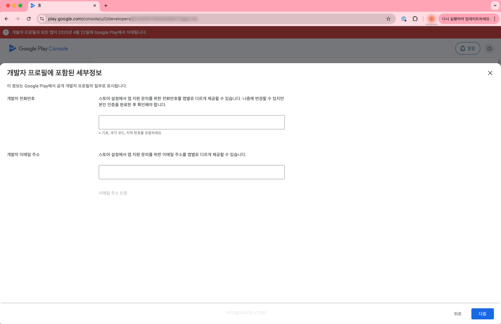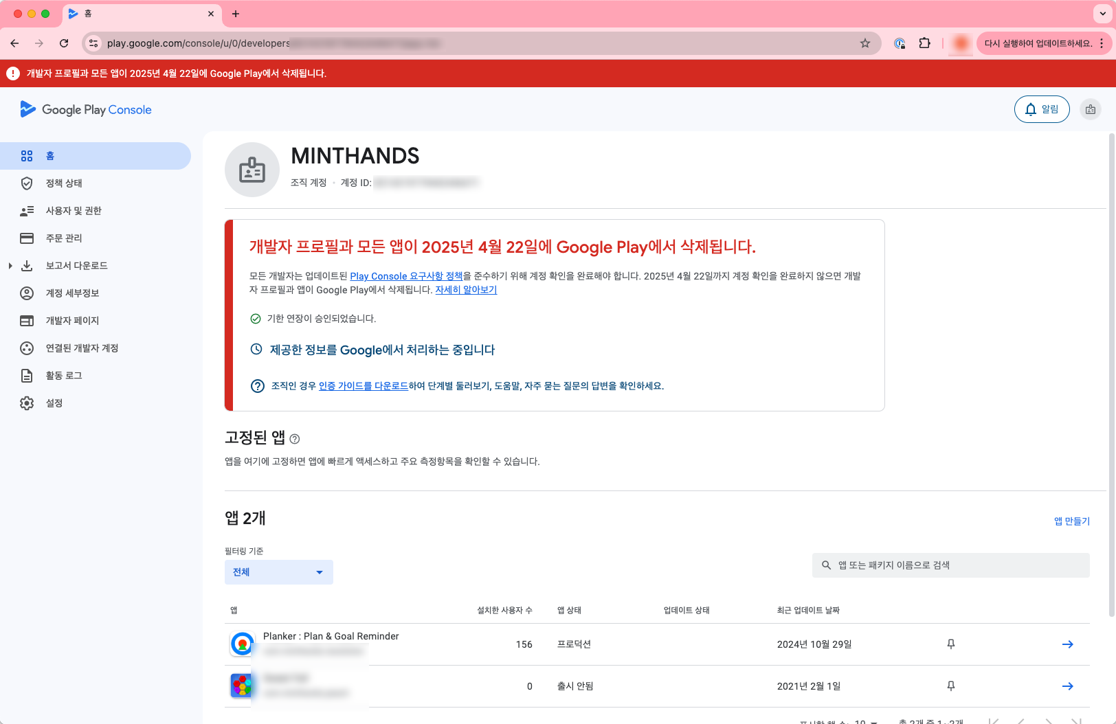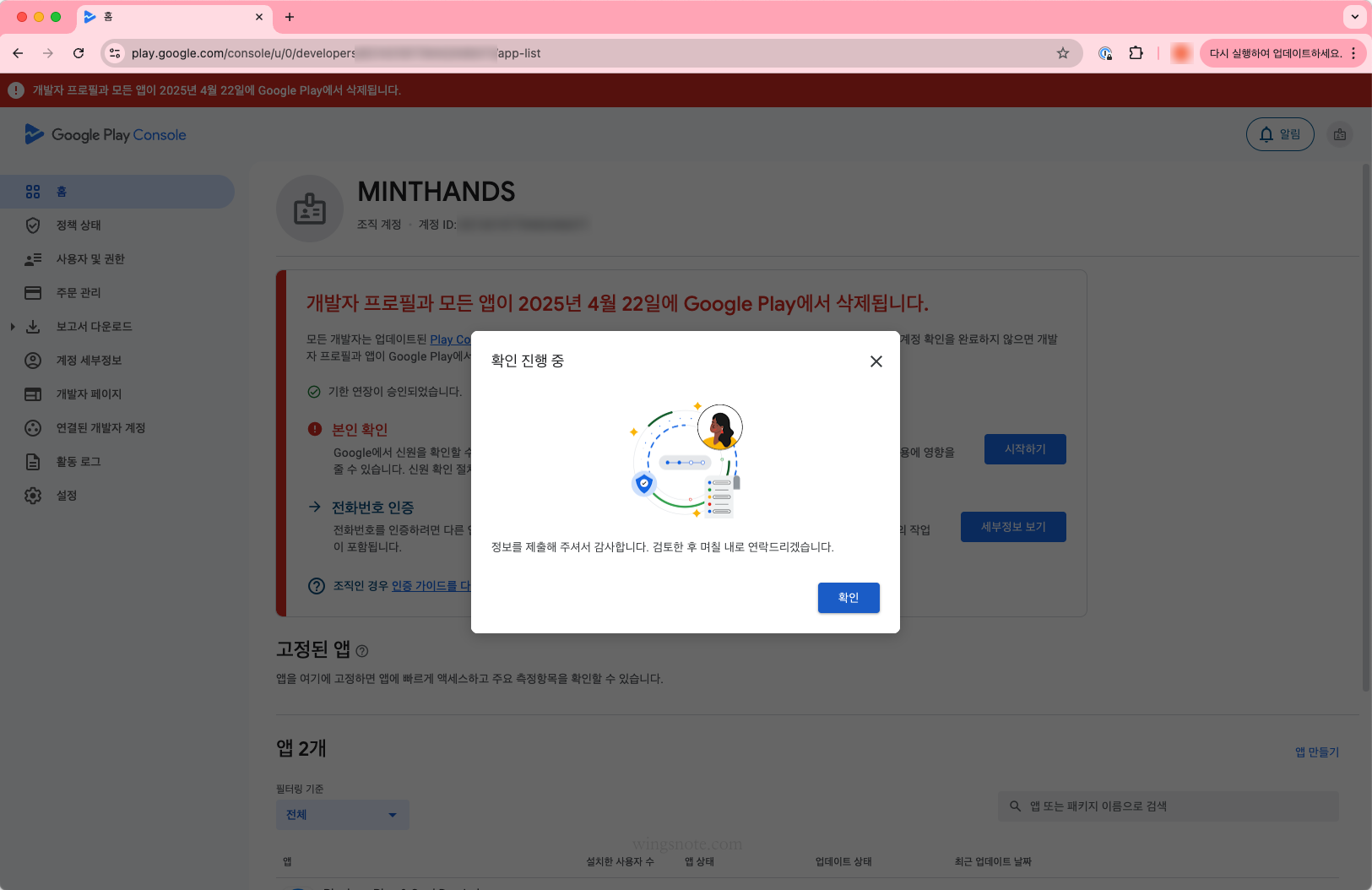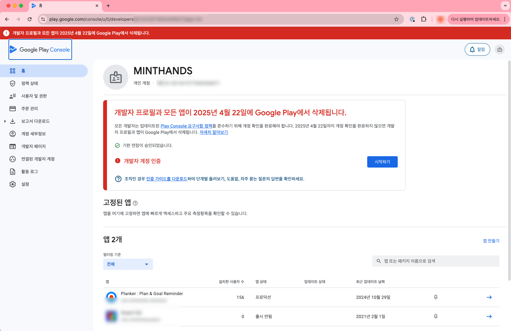 아래 화면과 같이 기한 내에 개발자 계정 인증을 하지 않으면 개발자 프로필과 모든 앱이 삭제 된다는 무시무시한 경고를 볼 수 있습니다.