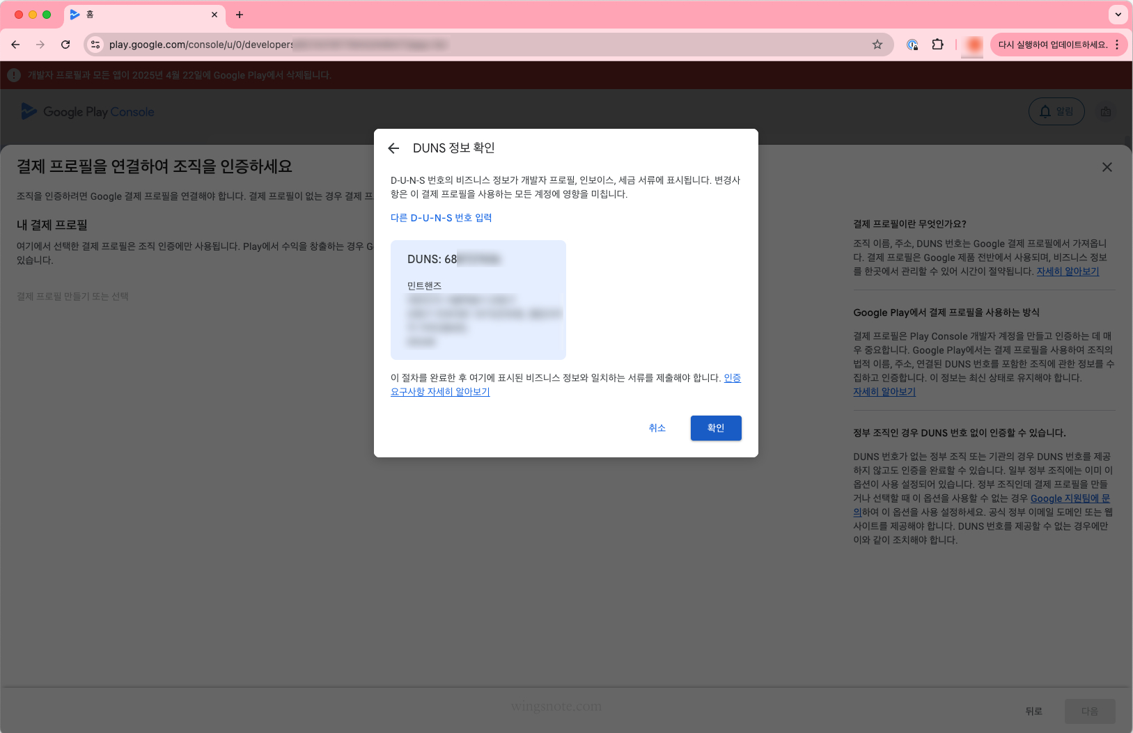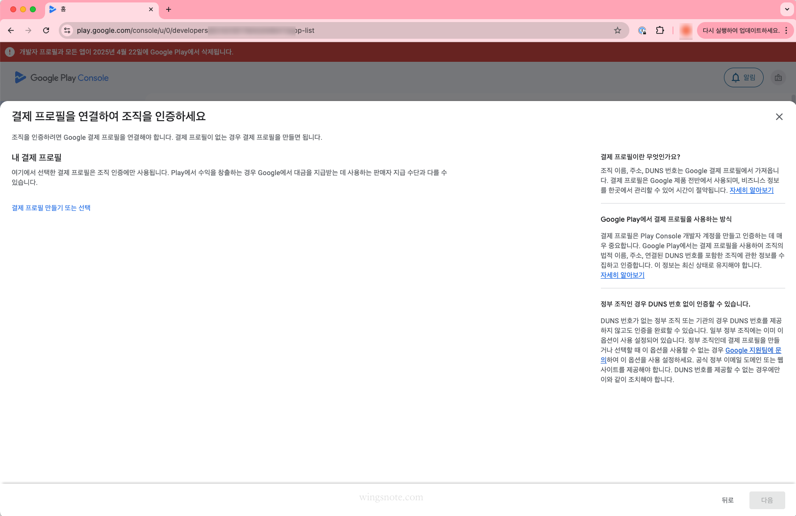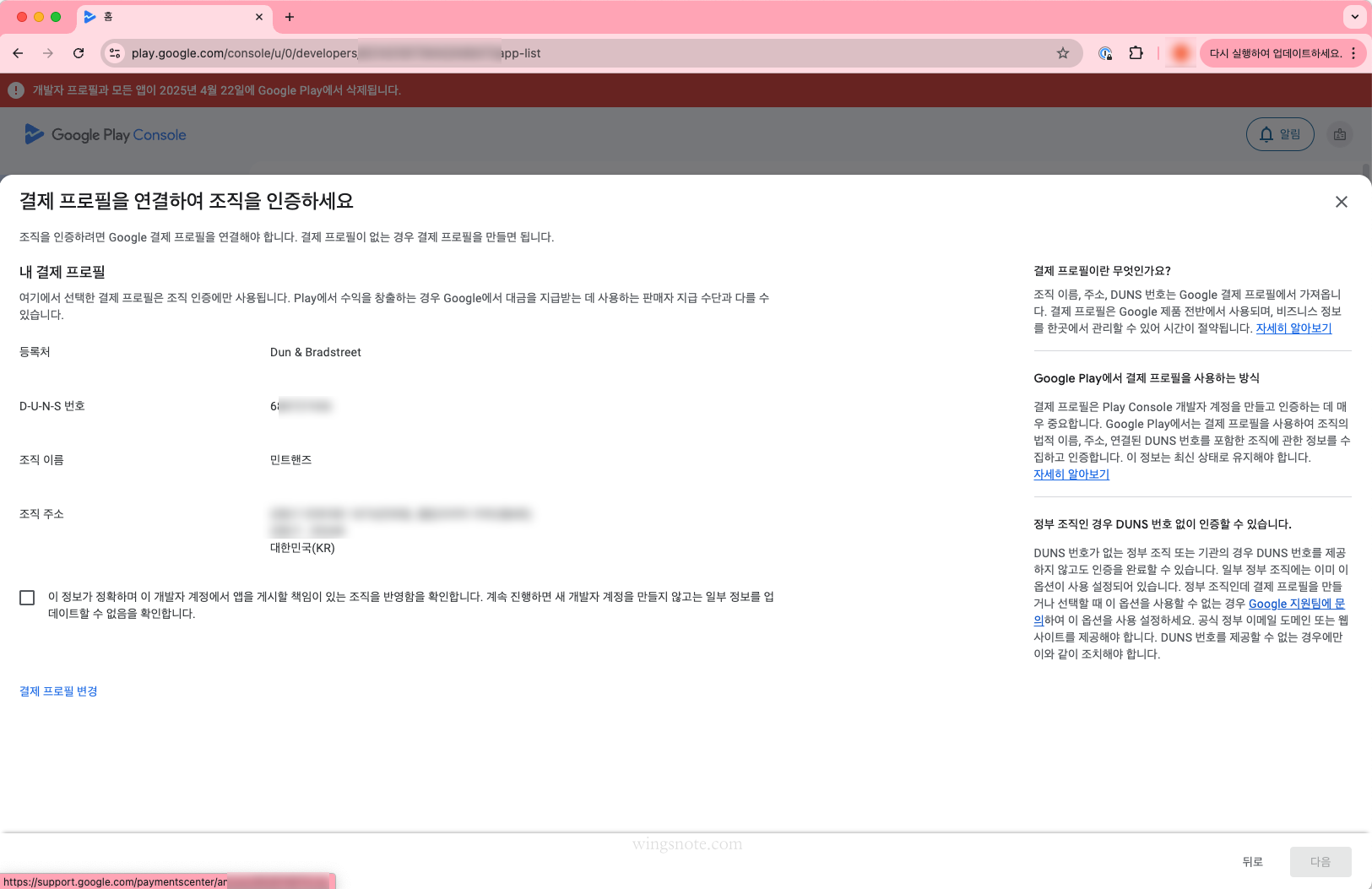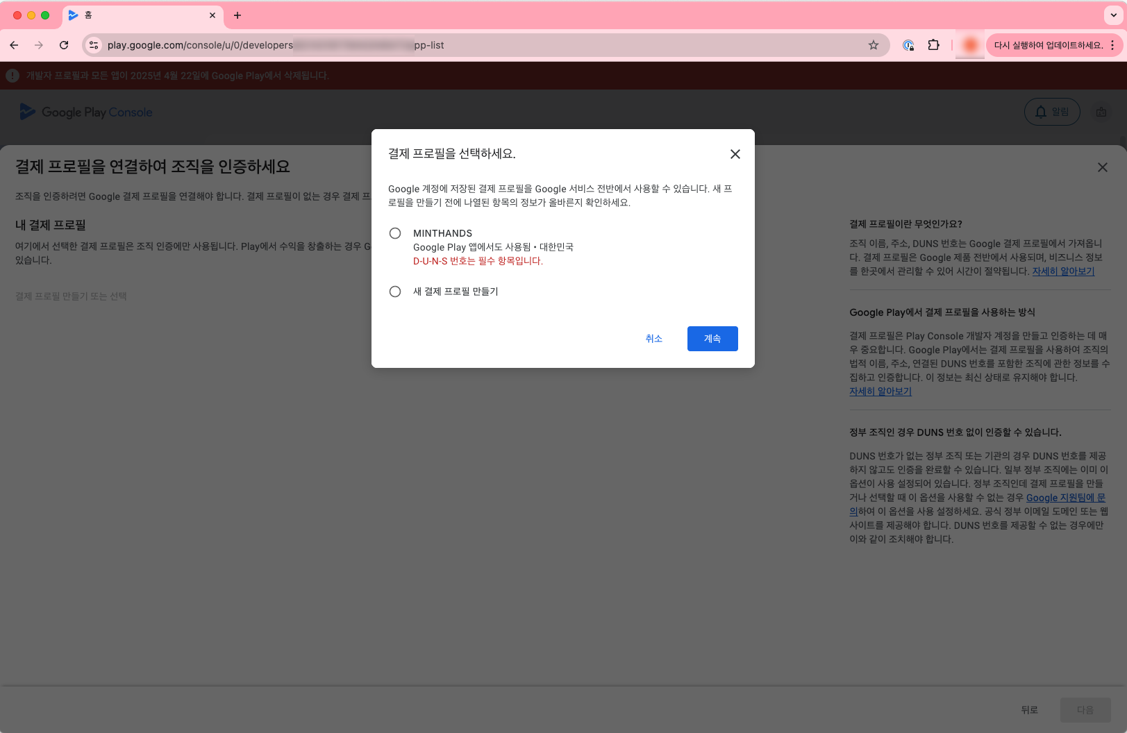 저는 처음에는 기존 결제 프로필을 사용하려고 기존 프로필은 선택했는데, DUNS에서 읽어오는 정보와 유사함에도 불구하고 뭐가 달라서 문제인지 정보가 다르다며 인증에 실패하더군요.