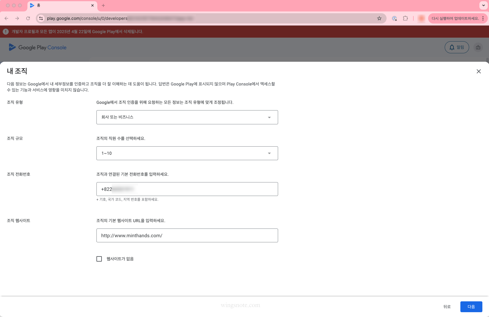 모두 입력하고 [다음]을 누릅니다. (웹사이트가 아직 없어도 인증받는데는 문제 없다고 하네요. 없는 경우 웹사이트가 없음을 체크)