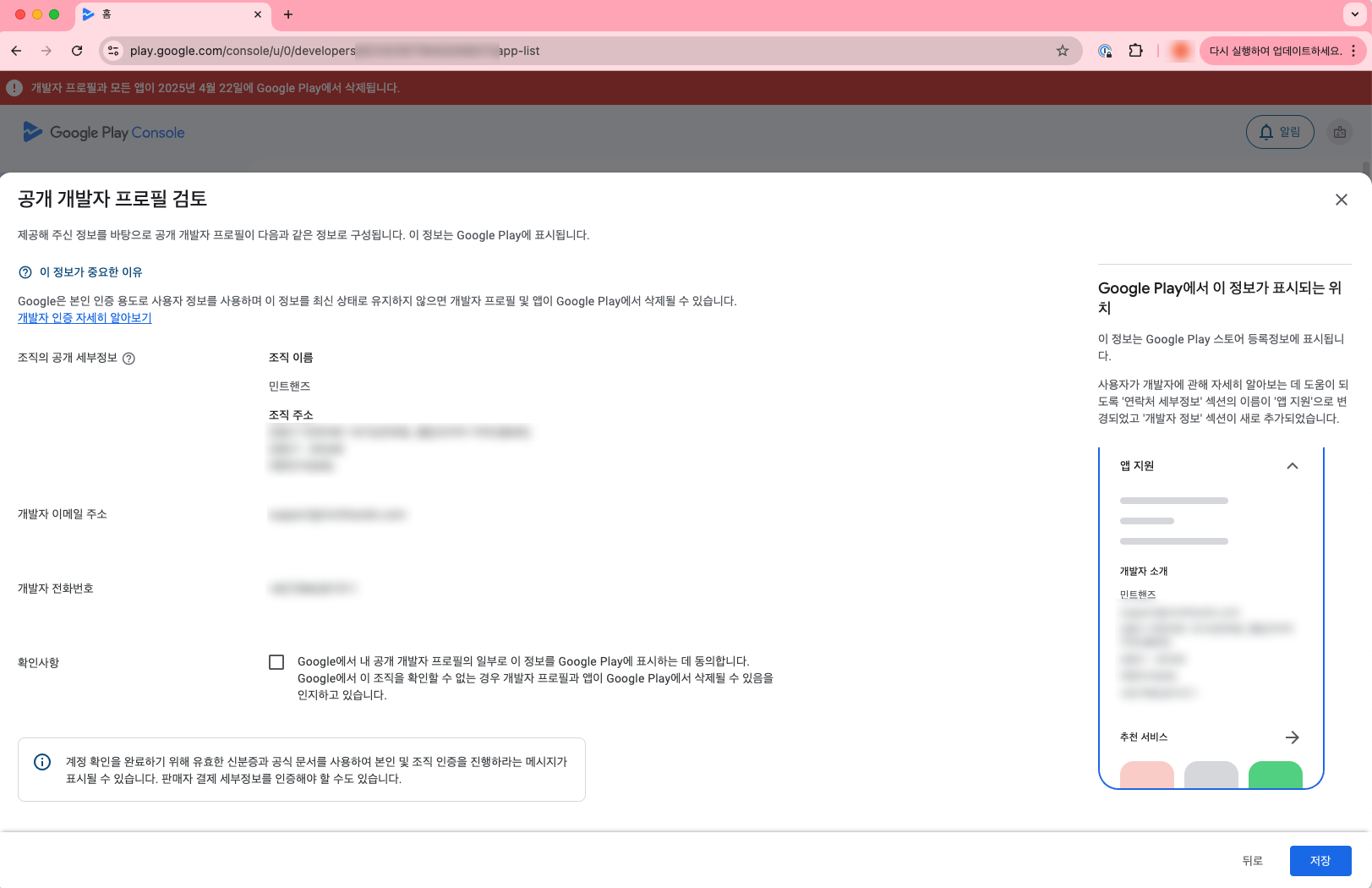 "공개 개발자 프로필 검토"페이지에서는 입력한 정보를 토대로 구글 플레이에 개발자 정보가 어떻게 노출 되는지 보여줍니다.
