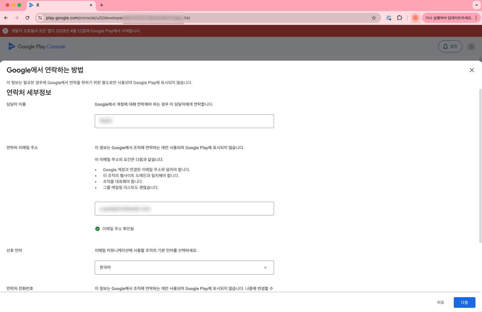 "Google에서 연락하는 방법" 페이지는 구글이 개발자에게 연락할 수 있는 정보를 입력합니다.