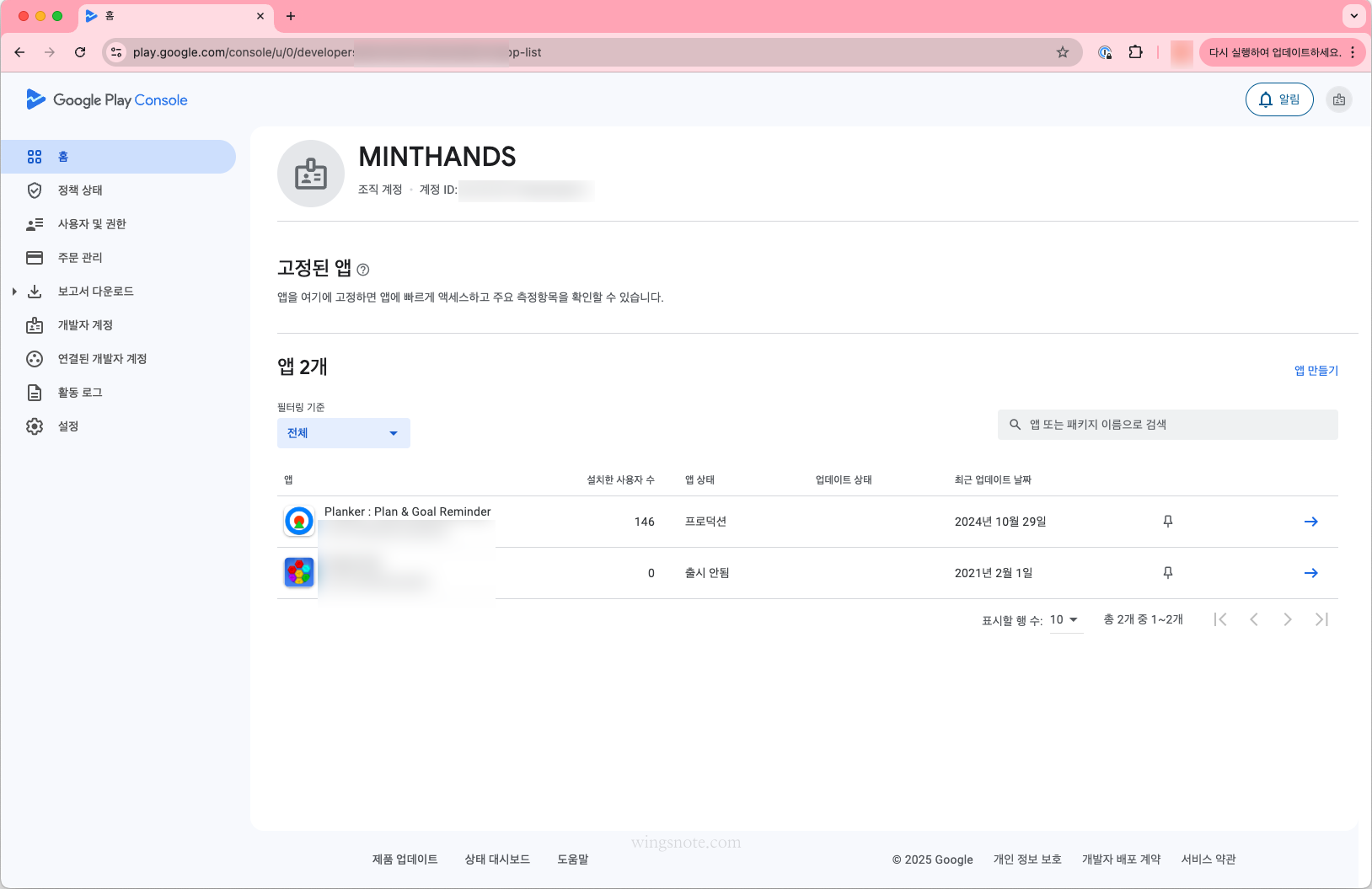1) 개발자 정보에 조직 이름으로 표기됨