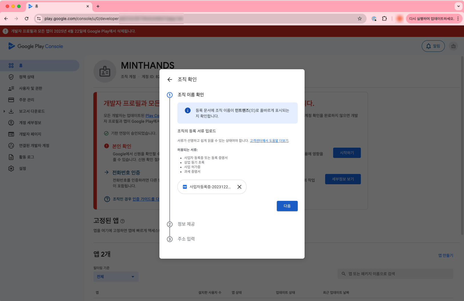 개발자 계정 인증이 어떤 단계로 진행되는지 안내가 나옵니다.