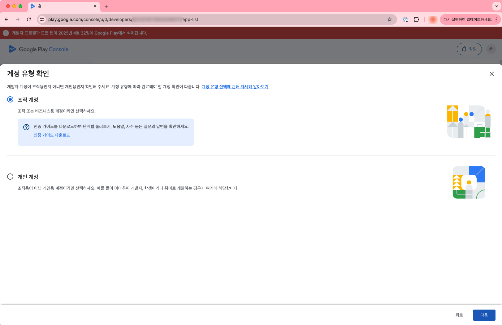 먼저 개발자 계정 유형은 "개인 계정"과 "조직 계정"이 있습니다.